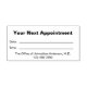 Este selo diz "Sua próxima nomeação" no topo. Há também linhas para a data e hora da nomeação. Há também texto de exibição que você pode editar para criar uma mensagem personalizada, se desejar. A parte inferior tem texto de exibição que você pode editar para o nome do médico (ou nome de prática) e o número de telefone. Todo o texto pode ser editado ou excluído.