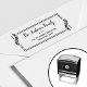 Adicione um toque de elegância clássica à sua correspondência com este carimbo de endereço de devolução personalizado. O quadro de folha na moda e a fonte do script criam uma aparência sofisticada. Personalize-o facilmente com seu nome e endereço de família.