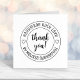 Simples carimbo redondo com a mensagem Obrigado cercada por texto personalizável. Observe que talvez seja necessário ajustar as informações digitadas adicionando ou excluindo alguns caracteres para fazer o texto alinhado corretamente.