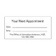 Este selo diz "Sua próxima nomeação" no topo. Há também linhas para a data e hora da nomeação. Há também texto de exibição que você pode editar para criar uma mensagem personalizada, se desejar. A parte inferior tem texto de exibição que você pode editar para o nome do médico (ou nome de prática) e o número de telefone. Todo o texto pode ser editado ou excluído.
