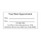 Este selo diz "Sua próxima nomeação" no topo. Há também linhas para a data e hora da nomeação. Há também texto de exibição que você pode editar para criar uma mensagem personalizada, se desejar. A parte inferior tem texto de exibição que você pode editar para o nome do médico (ou nome de prática), o número de telefone e uma mensagem personalizada, como seu endereço de rua. Todo o texto pode ser editado ou excluído.