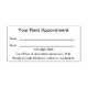 Este selo diz "Sua próxima nomeação" no topo. Há também linhas para a data e hora da nomeação. Há também texto de exibição que você pode editar para criar uma mensagem personalizada, se desejar. A parte inferior tem texto de exibição que você pode editar para o nome do médico (ou nome de prática), o número de telefone e uma mensagem personalizada. Todo o texto pode ser editado ou excluído.