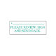 Este design de carimbo simples contém a mensagem "POR FAVOR, REVISAR, ASSINAR E ENVIAR PARA TRÁS.", juntamente com uma linha em que uma assinatura ou iniciais poderiam ser escritas acima. Pode ser utilizado por um professor ou por um profissional administrativo para solicitar que alguém reveja e reconheça o conteúdo de um documento ou de outra documentação.