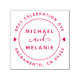 Este moderno design de punho autopicante de casamento apresenta "e" em uma letra manuscrita com espirais junto com os nomes dos casais e o endereço de volta redonda em uma fonte sans-serif com dois corações nas laterais.