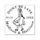 Peça a seu convidado que marque seus calendários para seu encontro muito importante com nossa bela vintagem Alice no casamento temático da Terra Maravilha, salve o selo de autodeterminação de data. Perfeito para um casamento com a Alice no País das Maravilhas. Restaurámos meticulosamente a ilustração icônica de Alice no País das Maravilhas, desenhando à mão e trazendo-a à vida. Personalize com a data do casamento e os nomes dos casais.