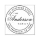 Um elegante carimbo de endereço de retorno redondo. No centro, o nome é escrito em uma caligrafia elegante, com a palavra "família" em letras maiúsculas pequenas abaixo. . Está rodeado pelo endereço, escrito entre dois círculos, com letras maiúsculas, a rua acima, a cidade e o estado abaixo. O círculo menor é interrompido.