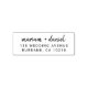 O endereço de retorno de casamento moderno e minimalista é um carimbo de autoimpressão, em um design simples, mas elegante, com o nome da noiva e do noivo na tipografia do roteiro de caligrafia manuscrito em na moda, emparelhado com um texto personalizável de endereço de correio em uma fonte sans serif de tendências para um toque chic, sofisticado em preto e branco clássico. Planejar um casamento ou procurar ideias? Esta design é perfeita para um casal recém-engajado que quer um belo e único carimbo de envelope para os seus convites para casamento, RSVP's, cartas de agradecimento e outros artigos de papelaria para enviar aos seus convidados que vão combinar com a sua decoração de casamento e com o tema da sua cerimônia e recepção. Personalize este convite de casamento adicionando os detalhes do seu casamento. É uma bela escolha para casamentos formais em qualquer estação. Estão disponíveis textos e layouts alternativos na nossa coleção de Carimbos de Endereços de Devolução de Casamento.