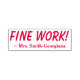 Este design de carimbo contém a mensagem "FINE WORK!", e um nome de professor personalizado. Pode ser usado por um professor enquanto formando tarefas para reconhecer um aluno que fez um trabalho particularmente bom.
