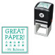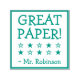 Este encorajador design de carimbo apresenta a mensagem inspiradora "PAPEL EXCELENTE!" e um nome personalizado de professor. Também apresenta formas decorativas de estrelas. Ele poderia ser usado por um professor, educador, instrutor ou tutor ao marcar tarefas, para reconhecer que um aluno fez bem.