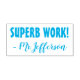 Este design de carimbo motivador apresenta a mensagem motivadora "SUPERB WORK!" e um nome de professor personalizado. Ele poderia ser usado por um professor, educador, ou tutor ao marcar tarefas, para reconhecer que um aluno fez bem.