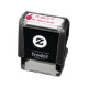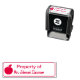 This self-inking stamp is a text template that you can edit to show a custom message. Currently, the top line of the display text says Property of. The bottom line is for the teacher's name (Shown: Mrs. Johnson's Classroom). An apple is next to the text.