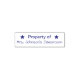 Este carimbo de tinta automática é um modelo de texto que você pode editar para mostrar uma mensagem personalizada. Atualmente, a linha superior do texto de exibição diz Propriedade de. A linha inferior é para o nome do professor (Exibido: Sala de Aula da Sra. Johnson). Uma estrela está em cada lado de Propriedade De.