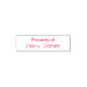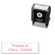 Este carimbo de autoimpressão é um modelo de texto que você pode editar para mostrar uma mensagem personalizada. Atualmente, a linha superior do texto de exibição diz Propriedade do. O resultado final é para o nome da criança (Mostrada: Propriedade de Mary Jones). O nome aparece em uma fonte no estilo de escrita manual.