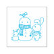 Um coelho bonito de desenho animado está prestes a dar a um boneco de neve um nariz de cenoura. O boneco de neve já está esportivo de um lindo cachecol tricotado. Um pequeno boneco de neve em forma de coelho e um pássaro completam a foto.