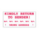 Este design de carimbo apresenta as mensagens "KINDLY RETURN TO SENDER!" e "⬩ WRONG ADDRESS ⬩", juntamente com os símbolos de seta. Pode ser utilizado para indicar que o correio postal recebido foi entregue no endereço errado e deve ser devolvido ao remetente.