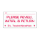 Este design de carimbo geek contém a mensagem "POR FAVOR, REVISAR, INICIAL E DEVOLVER", além de uma linha que pode ser escrita acima de uma assinatura ou iniciais. Ele também apresenta um nome personalizado de educador ou professor. Talvez pudesse ser usado por um educador, professor ou professor para pedir aos pais ou guardiães de um estudante que revejam o trabalho do estudante num teste, num exame, num jornal ou em qualquer outra tarefa escolar.