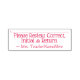 Este design de carimbo básico contém a mensagem "Please Review, Correct, Initial & Return" (Revise, corrija, inicial e devolva), além de uma linha que pode ser escrita acima de uma assinatura ou iniciais. Também apresenta um nome de professor personalizável. Talvez possa ser usado por um professor, educador ou tutor para pedir aos pais ou tutores de um aluno que revejam e reconheçam a marca que um estudante obteve num teste, num jornal, num teste, num exame ou noutra tarefa escolar.