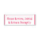 Este design de carimbo básico contém a mensagem "Please Review, Initial & Return Promptly", mais uma linha onde uma assinatura ou iniciais podem ser escritas acima. Pode ser usado por um educador ou um profissional administrativo para pedir que alguém reveja e reconheça o conteúdo de um documento.