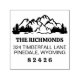 Rustic return address stamp with an illustration of craggy mountain tops and spruces and pines. Personalize with your family name, address, and zip code.