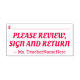Este design de carimbo básico contém a mensagem "POR FAVOR, REVISAR, ASSINAR E RETORNAR", juntamente com uma linha que a assinatura ou as iniciais podem ser escritas acima. Ele também apresenta um nome personalizado. Talvez pudesse ser usado por um professor, educador ou tutor para pedir aos pais ou tutores de um estudante que revissem e reconheçam a marca que um estudante recebeu em um teste, teste, papel ou outra tarefa escolar.