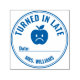This custom circular self inking stamp is designed to provide clear and consistent feedback regarding late assignment submissions in the classroom. The stamp features the bold, curved text “Turned in late” surrounding a sad face apple graphic, a universally understood icon for negative feedback or consequences. The clean, high contrast design ensures the message is clearly communicated to students and parents, promoting accountability in a firm yet non aggressive style. The template includes designated lines for date/signature and teacher's name allowing for specific administrative tracking. This compact and efficient stamp is frequently purchased by busy teachers and educators who need a quick, easy and professional way to mark papers that require attention.
