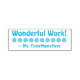 Este design de carimbo motivador apresenta a mensagem elogiante "Trabalho Maravilhoso!" e um nome de tutor personalizado. Também apresenta ícones decorativos de flores. Ele poderia ser usado por um professor de escola, educador, instrutor ou tutor ao marcar tarefas, para indicar que o aluno fez um trabalho de excelente.