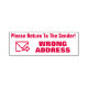 Este design de carimbo contém as mensagens "Please Return To The Sender!" e "WRONG ADDRESS", juntamente com um símbolo de envelope e seta. Talvez possa ser utilizado para indicar que o correio postal recebido foi entregue para o endereço errado ou para um destinatário desconhecido, devendo ser devolvido ao remetente.