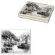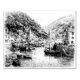 Um esboço preto e branco desenhado à mão de Lynmouth, Devon, uma charmosa aldeia costeira onde o rio East Lyn encontra o mar. Esta ilustração de linha ao estilo da safra captura o porto, barcos de pesca, cascos ribeirinhos e penhascos dramáticos. Perfeito para admiradores de viagem, história marítima e cenas tradicionais de aldeia inglesa.