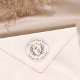 Minimalist wedding rubber stamp featuring a vintage-inspired monogram crest. The fine line art design is accented with graceful leaves on each side, creating a timeless and elegant emblem for your special day. Paired with classic typography, it's the perfect touch of understated sophistication. Add your address and use to stamp your return envelopes.