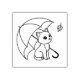 Cartoon illustration of a cute cat sitting under an umbrella and watching a falling leaf.