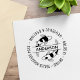 Um elegante carimbo de endereço para um casal com uma simples ilustração vetorial preto e branco de um par de peixes koi japoneses circulando um ao outro. O nome da família é escrito na ilustração enquanto os primeiros nomes e o endereço são impressos à sua volta. Observe que talvez seja necessário ajustar as informações digitadas adicionando ou excluindo alguns caracteres ou espaços para alinhar o nome e o endereço.