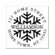 Um design de carimbo personalizado circular com um floco de neve por trás do seu nome familiar e rodeado pelos detalhes do seu endereço. Ideal para adicionar um toque extra estampado nos seus cartões de natal.