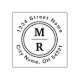 Este simples carimbo personalizado tem uma design moderna e minimalista. Duas iniciais estão posicionadas uma acima da outra e divididas por uma linha horizontal. Um quadro circular envolve a tipografia do monograma. Ao redor da parte externa do quadro, o endereço de retorno é escrito em texto curvo.