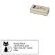 O selo de borracha humorístico mostra um gato preto legal com olhos grandes e uma cauda enrolada. Mostra o nome e o endereço. Personalizar e personalizar o texto. Design bonito, engraçado, legal e assustador para aqueles que querem um selo de etiqueta de endereço, mudando para uma nova casa, mudando de endereço, amantes de gatos, gatinhos e donos de animais de estimação.
