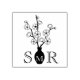 Galhos florescentes de cereja arranjados num vaso simples. Duas iniciais rodeiam a base com uma terceira inicial no próprio vaso.