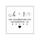 Este belo selo de borracha do casamento contém iniciais escritas à mão com espirais e morada de retorno de tipografia sans-serif com coração no fundo.