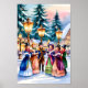 Um grupo de caroleiros vestidos de vintage cantando debaixo de lâmpadas de gás numa praça de cidade nevada.