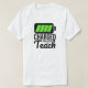 Esta camiseta é um presente perfeito para um professor retornando à escola após as férias; relaxado, descansado e recarregado. O design apresenta uma bateria preta totalmente carregada com linhas verdes de carga e escrevendo preto com as palavras 'Carregado e Pronto para Ensinar'.