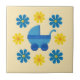 Carruagem de bebê azul com corte manual com fita azul e botões azuis colados nas rodas, fundo amarelo claro no Azulejo de Foto Cerâmica para cozinha e decoração doméstica. *Todas as coisas que você vê nos produtos são feitas à mão, mas você deve saber que você consegue uma foto!
