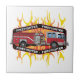 O carro de bombeiros bonito é o foco deste presente do sapador-bombeiro! Viatura de incêndio vermelha do fogo com fundo da chama! O texto do SAPADOR-BOMBEIRO cerca o carro de bombeiros com grande fundo da chama! Prefeito para sapadores-bombeiros, família e quartéis dos bombeiros!