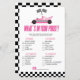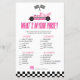 Este é um carro de corrida cor-de-rosa O que está no jogo do seu Chá de fraldas. O que há na sua bolsa? - Os convidados terão pontos para cada item que tiverem na bolsa. Quem ganha mais pontos, ganha!