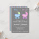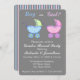 Menino ou menina? Este convite para na moda é excelente de convidar amigos e família para uma festa reveladora de gênero onde todos aprenderão o gênero do bebê. Sofisticado e espinhoso, este convite apresenta carruagems cor-de-rosa e azuis para bebês. O robusto cor-de-rosa é acentuado com lavanda roxa e o robusto azul é acentuado com verde limão. Totalmente personalizável para o seu partido. O verso tem faixas azuis e cor-de-rosa em um fundo de cinza (cinza). Os buggies são arte original de Phyllis Dobbs.