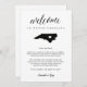 Compartilhe uma mensagem de boas-vindas para seus convidados de casamento da Carolina do Norte, bem como um itinerário ou calendário dos eventos do fim de semana. Frente mostra sua mensagem de boas vindas com um mapa da silhueta do estado da Carolina do Norte com um dentro de coração. Personalize o reverso com o dia do casamento ou o itinerário do fim de semana do casamento. Perfeito por incluir nas bolsas de boas-vindas do hotel ou entregar aos quartos dos seus convidados.