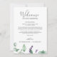 Estas cartas de boas-vindas e cartas itinerárias são perfeitas para um casamento simples e elegante ao ar livre. O design floral apresenta folhas de cor aquosa de eucalipto e verde com espinhos de flores silvestres roxas. A frente da carta apresenta uma carta de boas-vindas e a parte de trás da carta apresenta o itinerário do casamento. Estas notas são perfeitas para casamentos de destino e bolsas de boas-vindas de hóspedes.