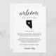 Compartilhe uma mensagem de boas-vindas para seus convidados de casamento em Nevada, assim como um itinerário ou agenda dos eventos do fim de semana. Front mostra sua mensagem de boas-vindas com um mapa da silhueta do estado de Nevada com um dentro de coração. Personalize o reverso com o dia do casamento ou o itinerário do fim de semana do casamento. Perfeito por incluir nas bolsas de boas-vindas do hotel ou entregar aos quartos dos seus convidados.