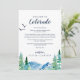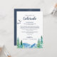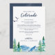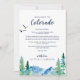 Estas cartas de boas-vindas do Colorado e cartas itinerárias são perfeitas para um casamento ao ar livre. O design apresenta uma paisagem de natureza selvagem pintada, azul e verde, com pinheiros de aquarela, pássaros e montanhas. A frente da carta apresenta uma carta de boas-vindas e a parte de trás da carta apresenta o itinerário do casamento. Estas notas são perfeitas para casamentos de destino e bolsas de boas-vindas de hóspedes. Personalize esta carta para qualquer local de casamento de destino de montanha.