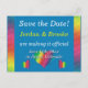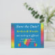 Um design simples, porém elegante, que coloca as informações importantes em destaque de uma forma fácil de ler. O fundo sólido bordeado por um toque de cor de arco-íris torna esse cartão postal difícil de ignorar na caixa de correio! Escolha qualquer cor que você goste para o fundo (mostrado aqui com um azul desbotado na frente e branco no verso). O verso é pré-formatado tanto para o endereço de retorno quanto para o do destinatário. Se você preferir escrever à mão seus Save the Dates, simplesmente deixe os campos de endereço do destinatário em branco. Use os campos de modelo fornecidos para personalizar rapidamente com suas informações. Clique em "personalizar ainda mais" para alterar a fonte, o tamanho, as cores e as posições.
