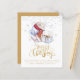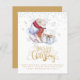 Um atraente cartão de Natal moderno ou outro cartão de férias/ano na carta de revisão com uma ilustração encantadora de aquarela de um Urso Polar vestido para o inverno num lenço quente pronto para abrir um presente de Natal. As borrachas de neve prateada estão caindo por toda parte. Dourada caligrafia e fundo completam o olhar. Os campos de modelo de texto à frente e atrás permitem que você adicione seu ano na revisão, a família e os amigos acessam os detalhes. Envelopes não incluídos. NOTA: Este elemento está disponível para impressão (e uso pessoal apenas) via Zazzle e não pode ser descarregado ou reproduzido digitalmente.