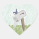 No pastel desenhando neste adesivo, um pássaro azul tem uma carta para enviar. O pássaro pequeno está segurando um envelope com seu bico, sentado em cima de uma caixa de correio de cinza que está montada em um posto de madeira. A caixa de correio fica, inclinada, em grama verde contra um céu azul pálido. Da minha imagem original criada digitalmente.