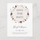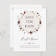 Este cartão-postal de save the date de flor silvestre de cor burgundy em cobre é perfeito para o seu casamento clássico rústico boho com rust, branco e marsala. O design apresenta uma grinalda boêmia ou buquê de flores silvestres modernas em aquarela roxa, vermelha, cinza e rosa desbotado, juntamente com folhagens laranja queimada e dourada. Apresentados no design estão papoulas e cevada. O design é ideal para um casamento simples e minimalista de outono ou verão de outono, primavera ou jardim country. Por favor, encontre outros artigos de papelaria de casamento correspondentes ou coordenados no restante desta coleção.